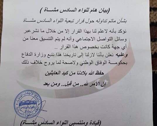 بيان:اللواء السادس مشاة يؤكد تبعيته لحكومة الوفاق