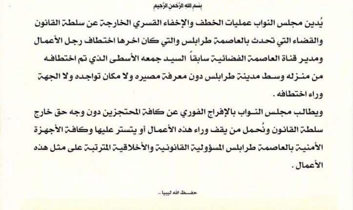 دان مجلس النواب في بيان له اليوم الخميس عمليات الخطف والإخفاء القسري الخارجة عن سلطة القانون والقضاء التي قال أنها تحدث بالعاصمة طرابلس وكان آخرها اختطاف رجل الأعمال ومدير قناة العاصمة سابقاً جمعة الأسطى .