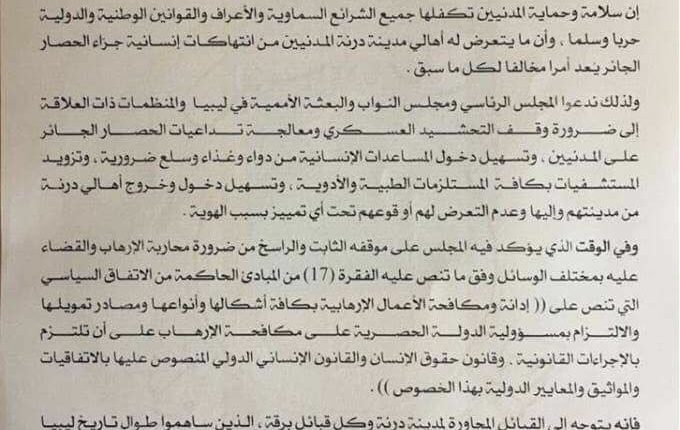 واعتبر أن سلامة المدنين تكفلها الشرائع السمواية والاعراف والقوانين الوطنية والدولية واعتبر المجلس في بيانه ان ما يتعرض له اهالي درنة من انتهاكات انسانية جراء الحصار امرا مخالفا لكل ما سبق .