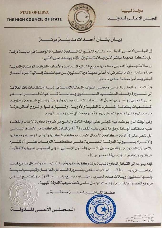 وعليه فان المجلس الاعلي للدولة يتوجه الي القبائل المجاورة لمدينة درنة وكل قبائل برقة الي ضرورة التدخل العاجل وتجنيب المدينة واهلها المدنيين ويلات هذه الحرب والمساهمة مع مؤسسات الدولة والمجتمع الدولي في رفع الحصار عن المدينة والبحث عن حل سلمي تحت شرعية الدولة الليبية.