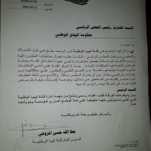 مدير عام قناة ليبيا الوطنية يتقدم بأستقالته إلي رئيس المجلس الرئاسي لحكومة الوفاق الوطني مسبباً ذلك بإهمال مخاطباتهم المتكررة بشأن متطلبات واحتياجات القناة.