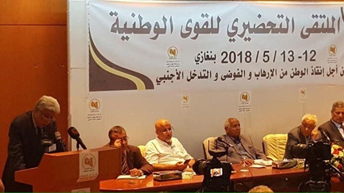 بسم الله الرحمن الرحيم ربنا افتح بيننا وبين قومنا بالحق وأنت خير الفاتحين استشعاراً لمعاناة الوطن وآلامه وانصاتا لأنين أبنائه المتزايد،واحساساً بالمسؤولية الوطنية،ورغبةً مخلصةً في الإسهام في استعادة الوطن وانقاذه من براثن الإرهاب والفوضى والعبث الأجنبي التقت نخبة من القوى الوطنية، في لقاء تحضيري يومي السبت والأحد الموافق 12 و13 / 05 / 2018 بمدينة بنغازي تحت شعار (من أجل إنقاذ الوطن من الإرهاب والفوضى والتدخل الأجنبي) وبعد نقاش مستفيض ومعمق حول القضايا المطروحة خلص المجتمعون لما يلي:-