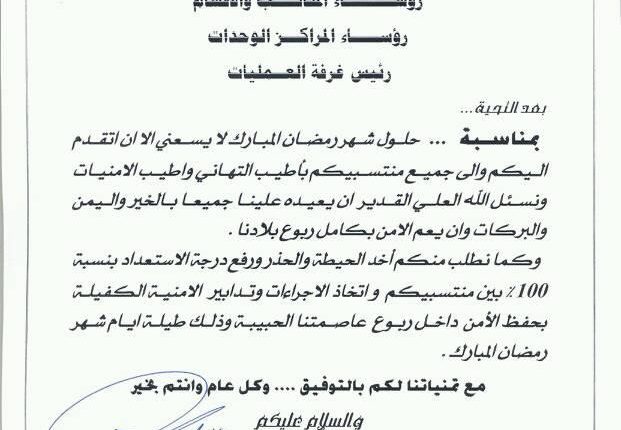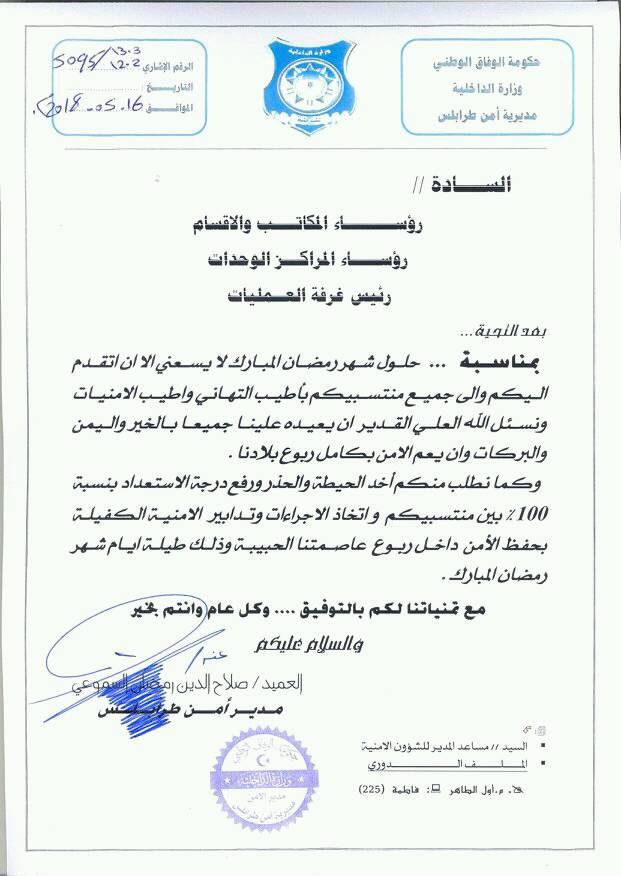 وقد هنئ مدير أمن طرابلس العميد صلاح السموعي رؤساء الأقسام والوحدات التابعة للمديرية ورئيس وأعضاء غرفة العمليات والمراكز الأمنية وكافة العاملين بمديرية أمن طرابلس بمناسبة حلول شهر رمضان المبارك،مطالباً اياهم باتخاذ كافة الإجراءات والتدابير الأمنية الكفيلة بحفظ أمن المواطن في هذا الشهر المبارك داخل نطاق مدينة طرابلس .