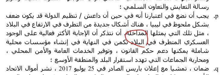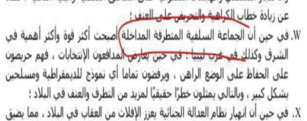 كما أشار التقرير إلى أن الجماعات السلفية المداخلة يرغبون في استمرار الوضع الراهن من الفوضى وحالة اللادولة فهم يرفضون الانتخابات والديمقراطية ومن مصلحتهم عدم قيام دولة ومؤسسات حتى يتمكنوا من نشر أفكارهم المتخلفة والمتطرفة والسيطرة على أكبر قدر ممكن من الأرض والمؤسسات ويفرضوا أفكارهم على المجتمع الليبي.