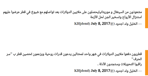 وبدون نقاش بدأت وسائل الاعلام الليبي الخليجي الممول من دويلات وامارات الخليج في تناقل الخبر دون تمحيص أو تدقيق أو بحث عن مصادر الخبر غير المصدر الأمني (الوهمي) الذي رفض الكشف عن اسمه للعبرية نت ولكن المال الخليجي يفعل العجايب في تحريك وتوجيه الأقلام المأجورة (عدة صحف ومواقع ليبية) حتى من بلد المليون شاعر “مروتانيا” (والشعراء يتبعهم الغاوون) ومراسلهم (عبقور)  “الخليل ولد اجدود” (صاحب خبر قطر تتعامل مع الجن والأرواح لحل الأزمة الخليجية التي أضحكت الوسط الإعلامي والعالم) الذي حشر أنفه الغير مرغوب به في الملف الليبي بتغريدات بالليبي أقل ما توصف أنها تدره الكبد وتطبيل زائد لبعض الشخصيات الليبية الهزيلة ونقل لبعض الأخبار تحت مسمى حصري وخطير لمنشورات ممولة تخدم أجندة أصحابها ولا علاقة لها بضوابط المهنة وأخلاقياتها.