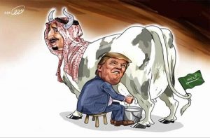 إن دويلة السعودية لا يليق بها إلا وصف الرئيس الأمريكي دونالد ترامب ” البقرة الحلوب” واذا جف ضرعها ذبحناها وقد أحسن الجزار ترامب حلبها حتى بانت عروقها وأفلست خزائنها,وأي مغامر يرغب في قليل من الحليب السعودي (انقدني يا حليب السعودية) ما عليه سوى شتم ايران والتحدير من المد الايراني (وليس المد الصهيوني) واعلان الحرب ودقت ساعة العمل ويختفي عن الأنظار حتى اشعار (وافلاس) آخر أو يتلقى صفعة ( حسينية) على قفاه تعيد له رشده وتلقم فاه حجر الحقيقة فيصمت (شاهت الوجوه) وعميت الأبصار وقد خاب من نشر ظلما.