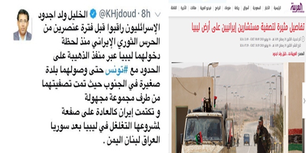 طالعنا اليوم اعلام آل سعود بخبر عنونه بـ ( تفاصيل مثيرة لتصفية مستشارين إيرانيين على أرض ليبيا) ونص الخبر: وقال مصدر أمني طلب عدم الكشف عن اسمه لـ”العربية نت” إن “الإسرائيليين راقبوا قبل فترة عنصرين من الحرس الثوري الإيراني منذ لحظة دخولهما ليبيا عبر منفذ الذهيبة على الحدود مع تونس حتى وصولهما بلدة صغيرة في الجنوب حيث تمت تصفيتهما من طرف مسلحين مجهولين يعتقد أن لهم علاقة بجهاز المخابرات الإسرائيلية الموساد”.