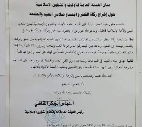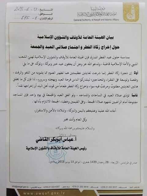 أعلنت الهيئة العامة للأوقاف والشؤون الإسلامية التابعة لحكومة الوفاق الوطني،اليوم الأربعاء الموافق 13-06-2018 في بيان لها جواز إخراج زكاة الفطر نقدًا أو من قوت أهل البلد.