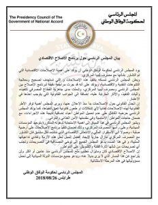 أعلن المجلس الرئاسي، اليوم الأحد 26-08-2018، تمسكه ببرنامج الإصلاحات الإقتصادية الذي كان قد اتفق عليه مصرف ليبيا المركزي بطرابلس.