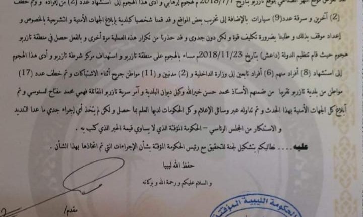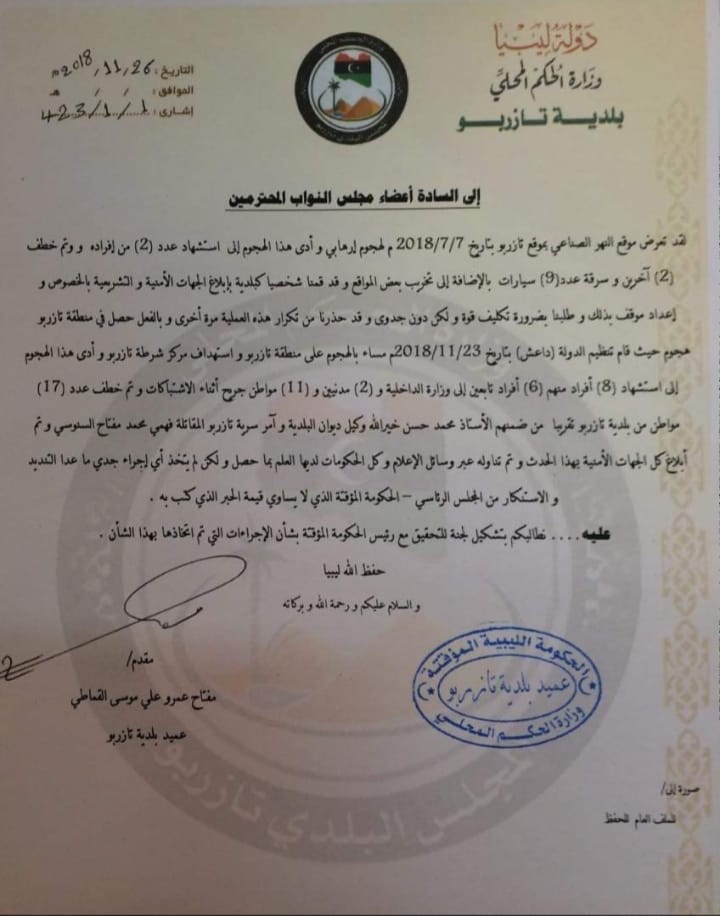 قامت بلدية تازربو بتقديم طلب رسمي تطالب فيه مجلس النواب بالتحقيق الفوري مع حكومة الثني (الحكومة الليبية المؤقتة) على تواطئها وتقصيرها في حماية المدنيين والمؤسسات بمنطقة تازربو وما حولها.