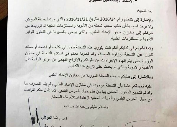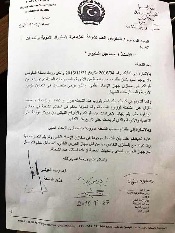 وأفاد تقرير أخر عن شحنة الأدوية الفاسدة (59حاوية)بقيمة تتجاوز 200مليون دينارالتي تم توريدها من طرف شركة المزدهرة المدعومة من (عقيلة صالح – اسماعيل الشتيوي – وعبدالله الثني) لصالح الامداد الطبي ورفض مديره الدكتور محمد السنوسي التباوي استلام الشحنة وراسله الثني برسالة رسمية لقبولها بحجة مقتضيات المصلحة العامة ورفض فتم تهديده وتهديد وزير الصحة رضا العوكلي وأصروا على موقفهم فتم اقالتهم عن العمل بدل شكرهم وترقيتهم.