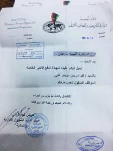 مرفق وثائق رسمية لموظف ليبي واسمه ((محمد ادريس أبوبكر)) يعمل وبرقارات وتكليفات رسمية في: