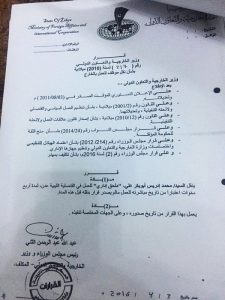 يذكر انه باعتبار صدور قرار لمحمد ادريس بالندب الى وزارة الخارجية وصدور قرار له بالعمل ملحق اداري في قنصلية ليبيا بعدن – لا يجوز له ممارسة عمله كمراقب مالي داخل ليبيا – المفروض الان خارج ليبيا يمارس عمله في اليمن.