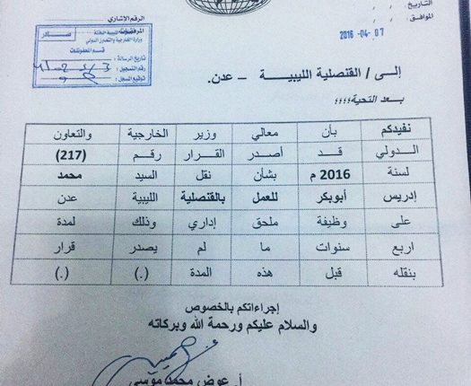 يذكر انه باعتبار صدور قرار لمحمد ادريس بالندب الى وزارة الخارجية وصدور قرار له بالعمل ملحق اداري في قنصلية ليبيا بعدن – لا يجوز له ممارسة عمله كمراقب مالي داخل ليبيا – المفروض الان خارج ليبيا يمارس عمله في اليمن.