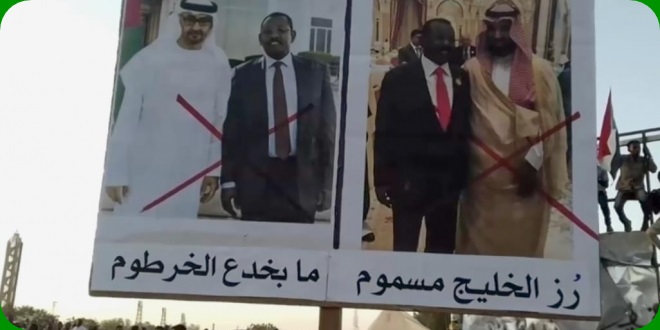 شعار رفعه المتظاهرون في العاصمة السودانية الخرطوم وكتب بخط عريض وواضح “أرز الخليج مسموم ما بخدع الخرطوم” على صور بن زايد وبن سلمان مع علامة اكس والرفض للتدخل الاماراتي السعودي في الأزمة السودانية ومحاولة بعض الأطراف السودانية اللجوء لهما فيما أسموه المساهمة في حل الأزمة وتقريب وجهات النظر بين الأطراف السودانية ولكن وعي الشارع السوداني ليس بمستغرب بثقافته ومتابعته للأحداث في المنطقة والدور التخريبي الذي تقوم به العاصمتان الرياض وأبوظبي والعائلاتان آل سعود وآل نهيان.