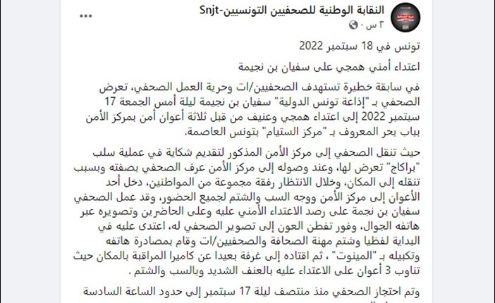 ونشرت نقابة الصحفيين في تونس بياناً، تندد فيه بـما وصفته بـ الاعتداء الأمني الهمجي على الصحفي التونسي.