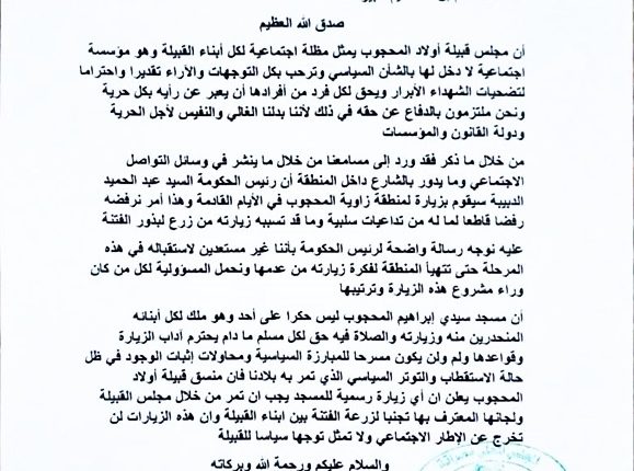 بعد المحاولة الفاشلة لزيارة زاوية المحجوب وطرده منها يوم الجمعة الماضي ارسل مبعوثين عنه للترتيب لزيارة أخرى ولكن طلبه قوبل بالرفض وصدر بيان رسمي عن قبيلة المحاجيب يعلنون فيه بكل وضوح رفضهم لزيارة الدبيبة محملين المسؤلية لأي طرف يحاول الترتيب له دون التنسيق المسبق وأخذ الاذن من مجلس القبيلة.