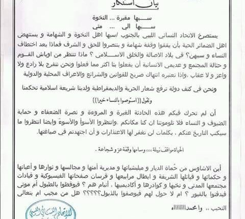 استنكر الإتحاد النسائي بالجنوب الليبي في مدينة سبها صمت رجال ليبيا عن الانهيار الأمني في الجنوب الليبي خاصة بعد ما وصل الأمر الى اختطاف النساء في ظاهرة تعد دخيلة على المجتمع الليبي المحافظ وفق البيان شديد اللهجة الذي حصل موقع بوابة ليبيا على نسخة منه.