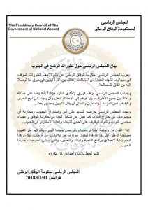 استنكر المجلس الرئاسي لحكومة الوفاق الوطني في بيانٍ رسمي الاحداث الجاية في مدينة سبها منذ عدة ايام