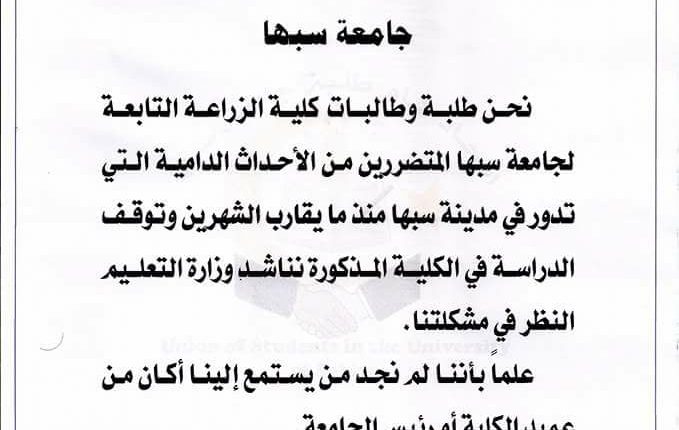 قال رئيس اتحاد طلبة كلية الزراعة بجامعة سبها منصور حديدان أن توقف الدراسة بالكلية عطل الفصل الدراسي بها، وتسبب في منع الطلبة من إجراء امتحاناتهم منذ أكثر من شهرين.