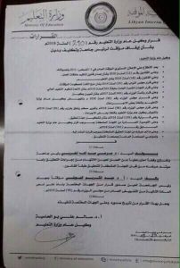 أصدر وكيل عام وزارة التعليم بالحكومة المؤقتة سالم بوالحاسية اليوم الخميس قرار يقضي بإيقاف رئيس جامعة بنغازي عن العمل بشكل مؤقت حتى انتهاء إجراءات التحقيق معه.