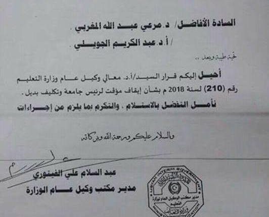 وكلف ذات القرار الصادر عن سالم بوالحاسية، عبد الكريم الجويلي، بمهام رئيس الجامعة لحين صدور قرار من الجهات المختصة.