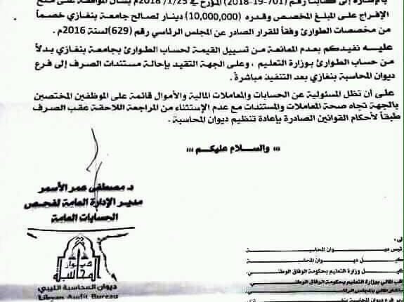 وأفادت الوثيقة، الممهورة بتوقيع الدكتور مصطفى عمر الأسمر مدير الإدارة العامة لفحص الحسابات العامة بديوان المحاسبة وتحمل الرقم الإشاري 18-19-1474، بعدم ممانعة المصرف من تسيل المبلغ المذكور لحساب الطوارئ بجامعة بنغازي بدلاً من حساب الطوارئ بوزارة التعليم .