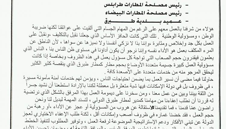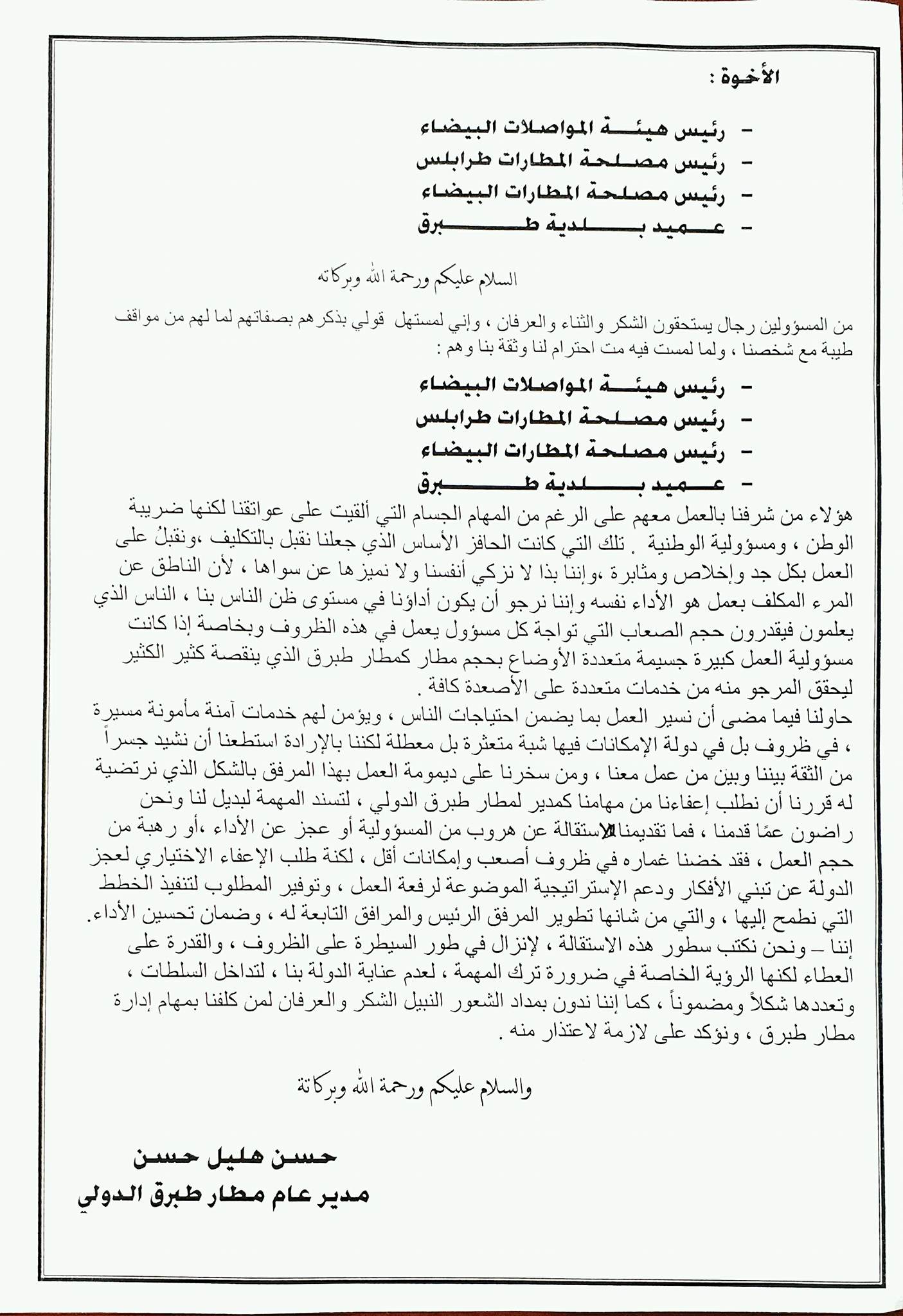وأعلن هليل استقالته في بيان تحصلت بوابة ليبيا علي نسخة منه وهو موجه إلى رئيس هيأة المواصلات بالبيضاء، ورئيس مصلحة المطارات طرابلس، ورئيس مصلحة المطارات البيضاء، وعميد بلدية طبرق.