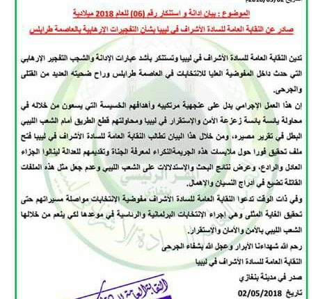 أدانت النقابة العامة للسادة الأشراف في ليبيا واستنكرت بأشد عبارات الإدانة والشجب التفجير الإرهابي التي حدث داخل المفوضية العليا للانتخابات في العاصمة طرابلس وراح ضحيته العديد من القتلى والجرحى واصدرت بيان تحصل موقع بوابة ليبيا الإخباري على نسخة منه.