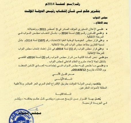 وإلزام مجلس النواب بضرورة سرعة اصدار قانون الإستفتاء علي الدستور بمجرد انتهاء اللجنة من عملها ، علي أن يتم أعتماد مجلس الدولة كجسم إستشاري شريطة أن يضم أعضاء المؤتمر الوطني العام المنتخبين في العام 7-7-2012.