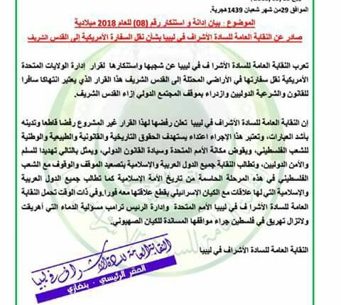 تعرب النقابة العامة للسادة الأشراف في ليبيا عن شجبها واستنكارها لقرار إدارة الولايات المتحدة الأمريكية نقل سفارتها في الأراضي المحتلة إلى القدس الشريف هذا القرار الذي يعتبر انتهاكا سافرا للقانون والشرعية الدوليين وازدراء بموقف المجتمع الدولي إزاء القدس الشريف.