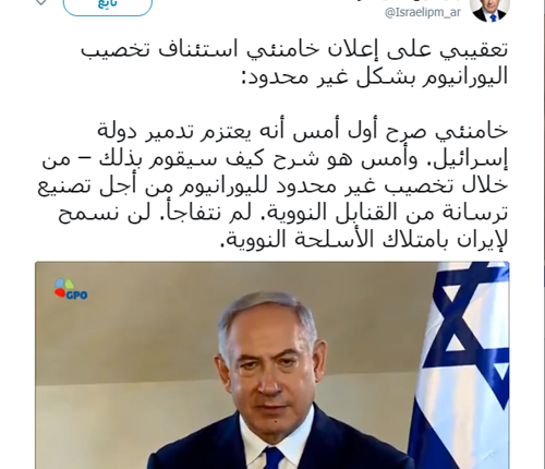 أكد رئيس الوزراء الاسرائيلي بنيامين نتانياهو أن خطة إيران لزيادة قدرتها على تخصيب اليورانيوم هدفها إنتاج أسلحة نووية ليتم استخدامها ضد اسرائيل وأضاف في مقطع فيديو نشر على تويتر “قبل أيام أعلن آية الله خامنئي، زعيم إيران، عزمه على تدمير دولة إسرائيل وأمس قال كيف سيفعل ذلك.. عن طريق التخصيب اللامحدود من أجل إنتاج ترسانة من القنابل النووية”  وأضاف نتنياهو “لم يفاجئنا الأمر ولن نسمح لإيران بامتلاك أسلحة نووية”.