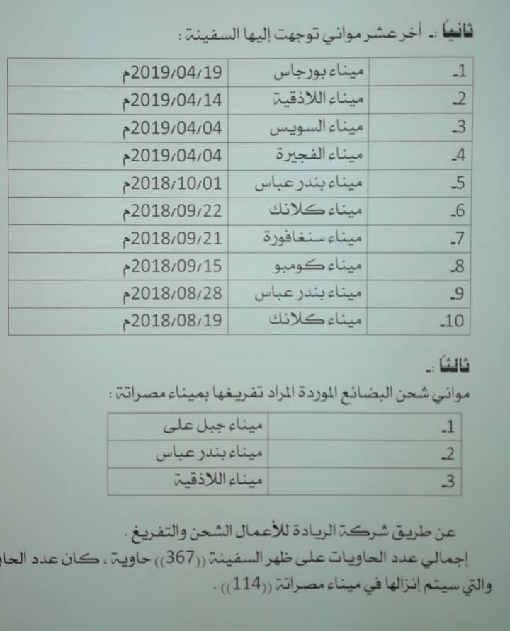 وقامت النيابة العامة بتكليف الجهات الضبطية بمباشرة التحقيقات فيما يتعلق بالوكيل الفعلي لشركة الملاحية الإيرانية بليبيا، وتفتيش البضائع بالكامل الموجودة بالسفينة، حيث وجِد عدد 4 حاويات تم شحنها من ميناء اللاذقية وبداخلها (مواد تجميل – مبيدات حشرية – ملابس – سجاد – أقمشة – معدات مطابخ – خراطيم مياه – فرن لصناعة الخبز بملحقاته وأحذية).