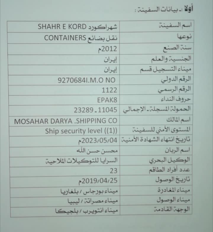 وأكدت الوزارة في بيان لها آنذاك إصدارها التعليمات للأجهزة الأمنية بالميناء لجمع المعلومات من السفينة والتأكد من إجراءاتها. وتبين من خلال التحريات التي أجريت من قِبل مديرية منفذ ميناء مصراتة ومركز جمرك ميناء مصراتة أن اسم السفينة SHAHR E.KORD، حرف النداء EPAK8، رقم السفينة 9270684، الجنسية إيران.