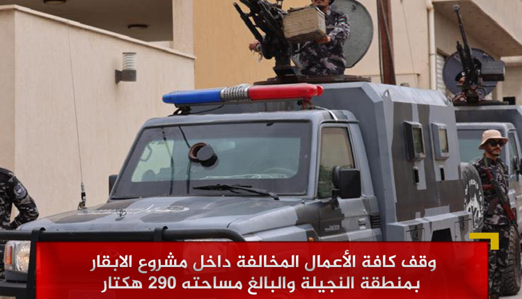 بناء على تعليمات السيد النائب العام ؛ اوقفت ادارة انفاذ القانون بالإدارة العامة للعمليات الأمنية اليوم الثلاثاء أين أعمال مخالفة داخل مشروع الابقار بمنطقة انجيلة “محطة الجزائر سابقاً” والبالغ مساحته 290 هكتار .